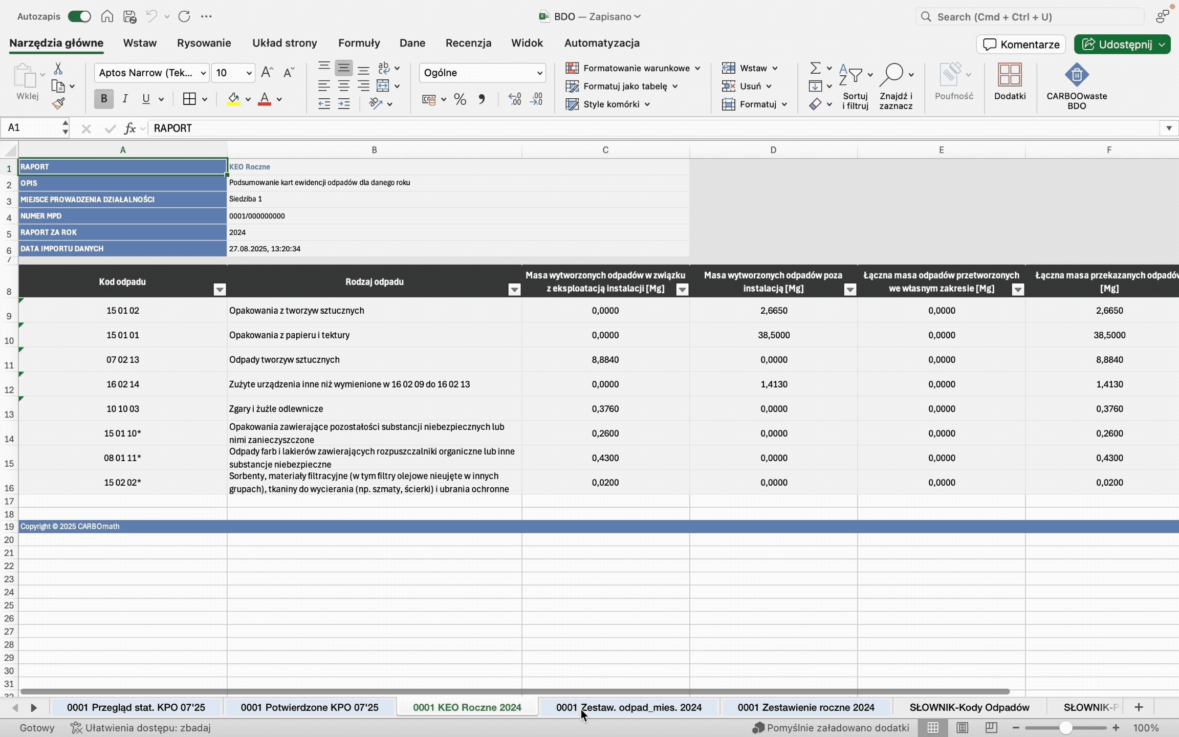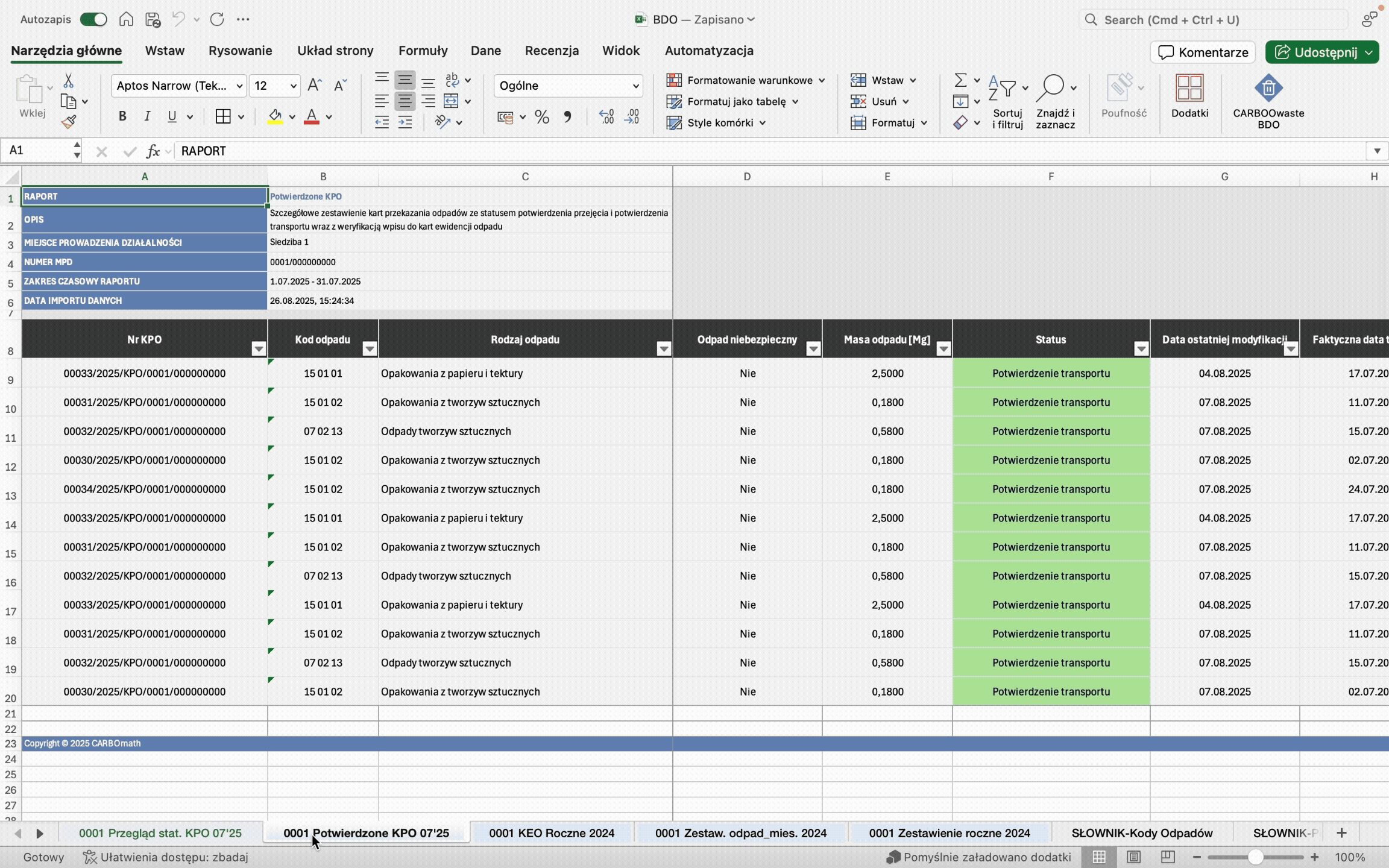 Bez dodatkowego oprogramowania – CARBOwaste BDO działa jako dodatek do Excela, nie wymaga dodatkowego oprogramowania.