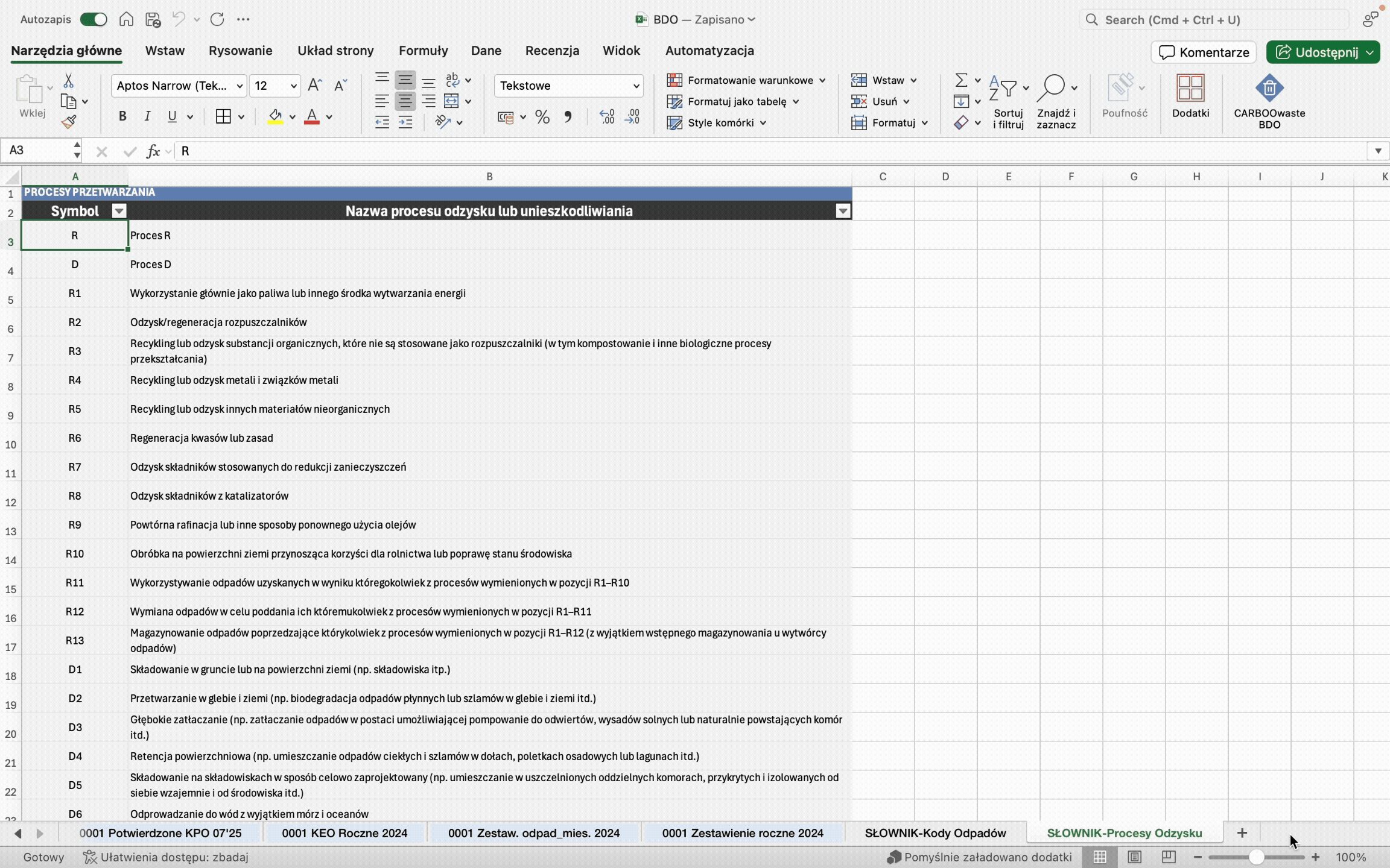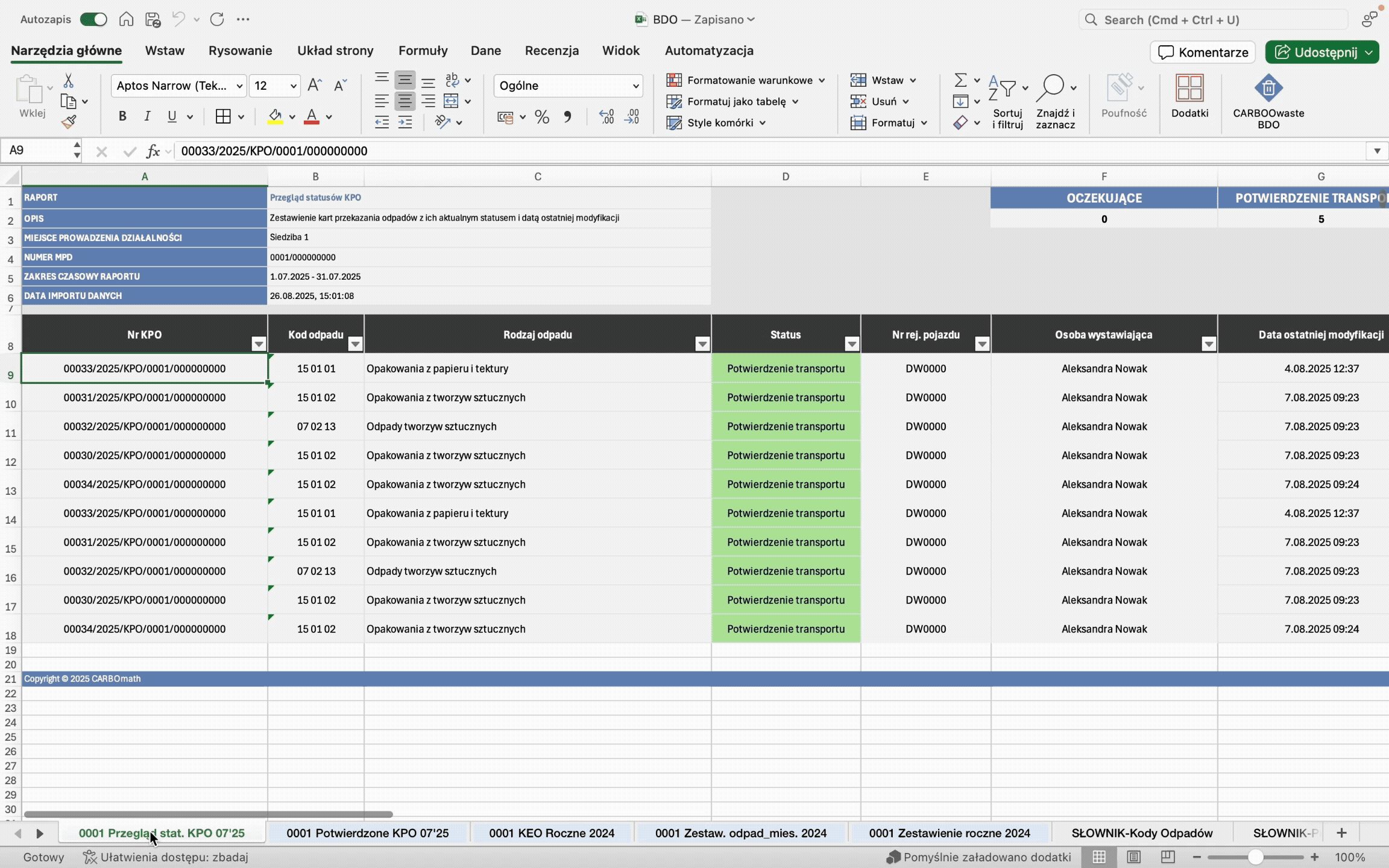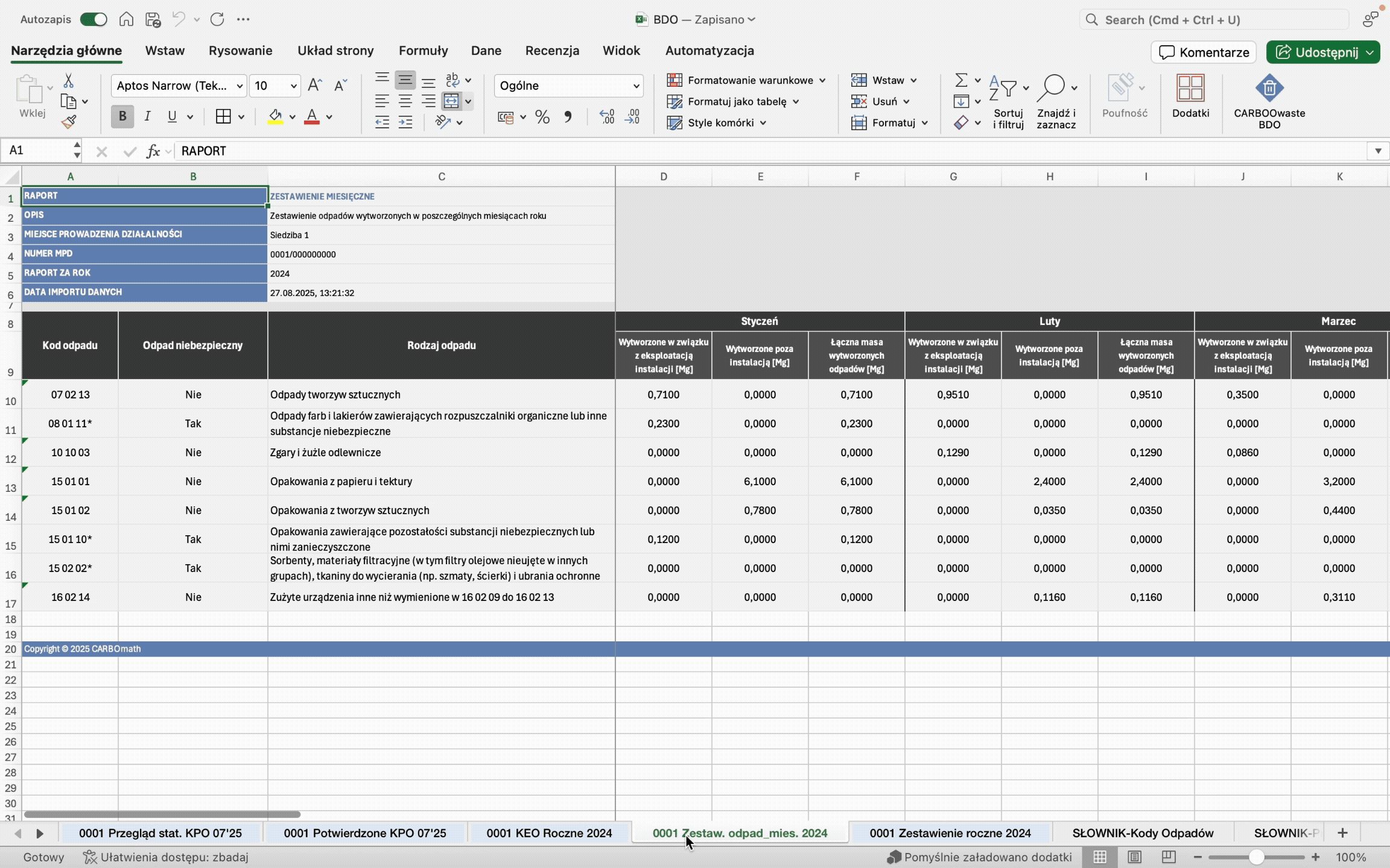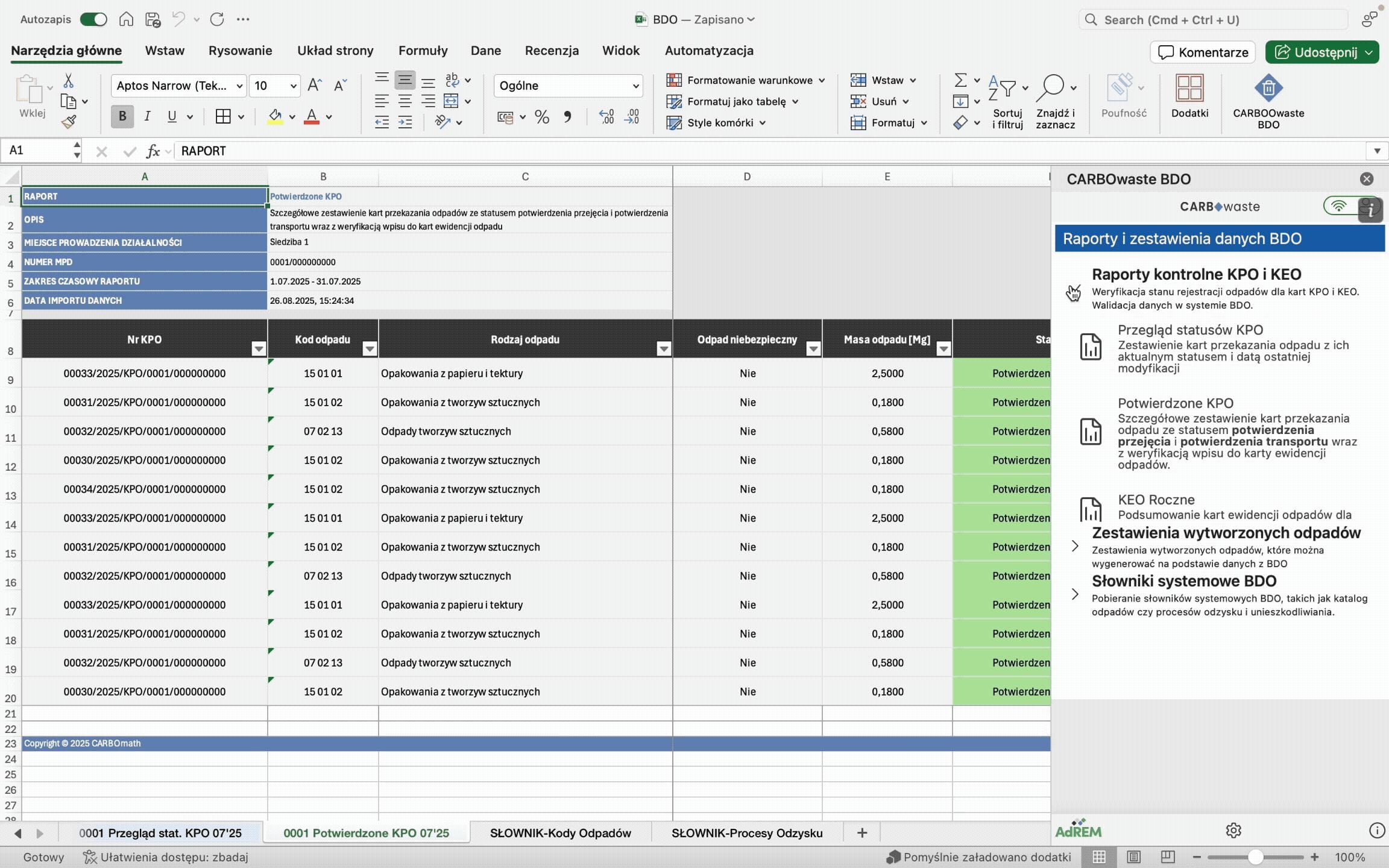 Bez dodatkowego oprogramowania – CARBOwaste BDO działa jako dodatek do Excela, nie wymaga dodatkowego oprogramowania.